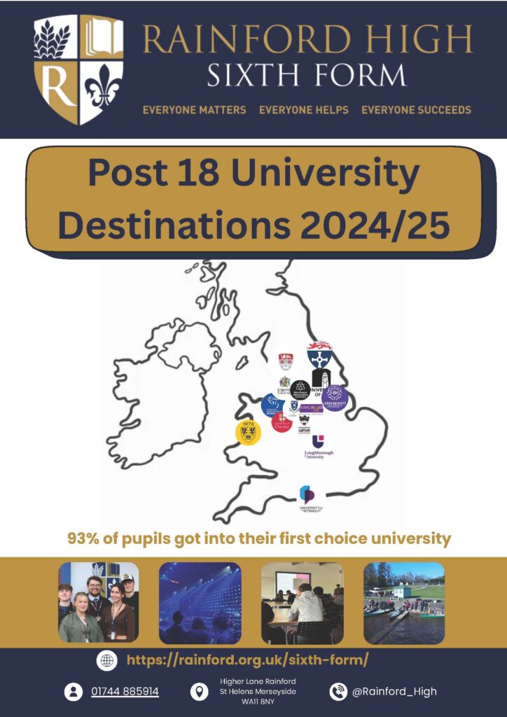 Rainford Sixth Form has a proven track record of supporting pupils in pursuing academic pathways at Degree Level. Last year 93% of University applicants from Rainford Sixth Form were awarded a place at their first choice university. This is a testament to all of the hard work these students put in and the support they received from their family, carers, friends and sixth form staff. Year on year a growing number of pupils choose to pursue an apprenticeship or employment following their time at Rainford Sixth Form and we are proud to see them secure placement as with brilliant companies in thriving areas of industry.